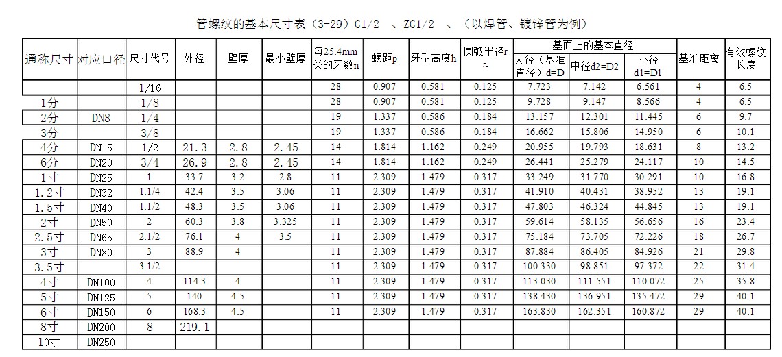 盈高金属烧结滤芯管螺纹接口基本尺寸对照表